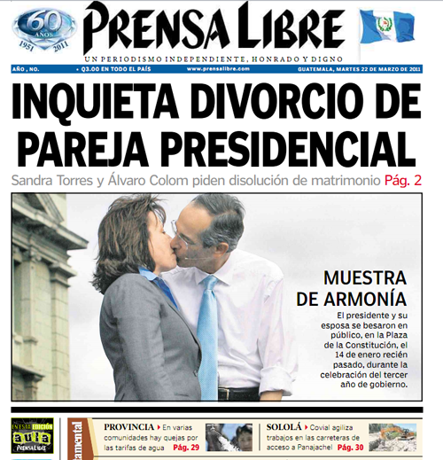 No obstante lo cual hoy ha trascendido que ese mismo día los esposos Colom habían presentado su demanda de “divorcio voluntario”, cuya resolución esperan para fecha muy próxima, porque para eso fue que hicieron aprobar en tiempo record en el Congreso de la República el procedimiento para obtener un divorcio express, aunque solamente sea para “jugarle la vuelta” a la Corte de Constitucionalidad (CC)… y al ingenuo, o baboso, o pendejo pueblo de Guatemala. La información fue confirmada esta tarde por Edwin Escobar, portavoz del OJ y la Corte Suprema de Justicia.La solicitud se plantearon ambos el 11 de marzo último y, según Escobar, eso facilita la separación. No obstante, no dio a conocer cuánto tiempo puede demorar. El caso se conoce en el Juzgado Segundo de Familia capitalino.